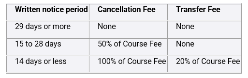 16.1.2 Cancellation Fees and/or Transfer Fees below shall apply to cancellation or rescheduling of any Course by the Client, which the Client shall pay within 30 days of the invoice: